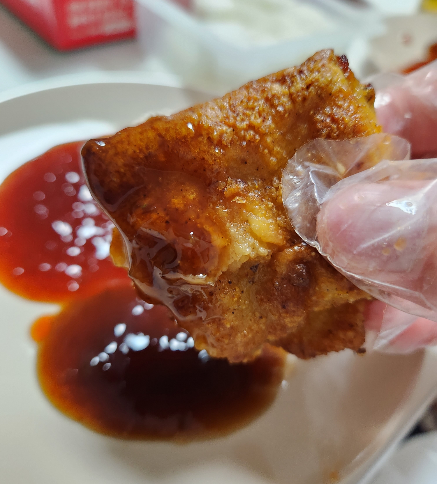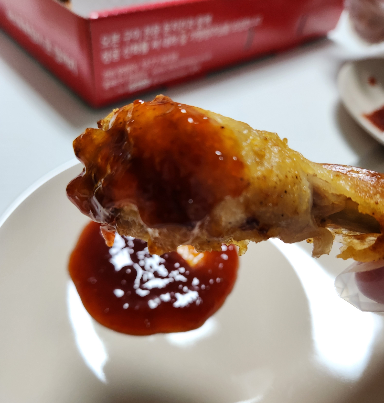 먼저 매운 소스에 닭다리를 찍어먹어 봅니다