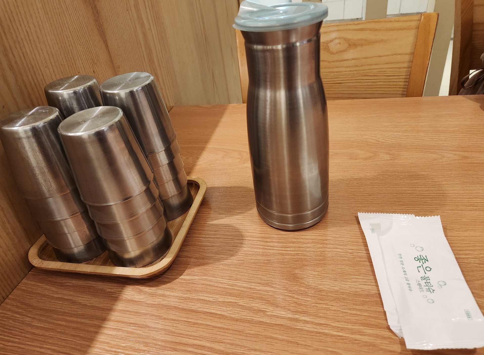 식탁엔 컵과 물, 물티슈가 세팅되어 있었습니다